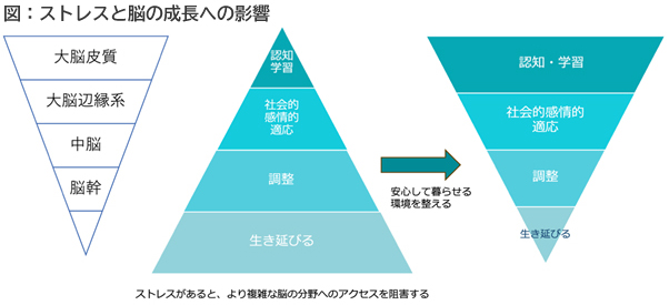 勉強に遅れがあったり集中できなかったりすることも行動なので、叱咤激励をすれば解決するわけではない。子どもにとって必要な支えがなければ、より複雑な脳の分野への成長は十分に進まない。例えば、両親が喧嘩していたり、親が重い病気なのに十分な支えがなく子どもが心配して暮らさなければならなかったりする状況があると、子どもは「生き延びる」ことにたくさんのエネルギーを費やすことになる。この状況が続く限り、より複雑な脳の分野へのアクセスは困難になる。安心して暮らせる環境を整えることで、徐々に社会的感情的適応や認知や学習を司る部分が成長の機会を得られるようになる。