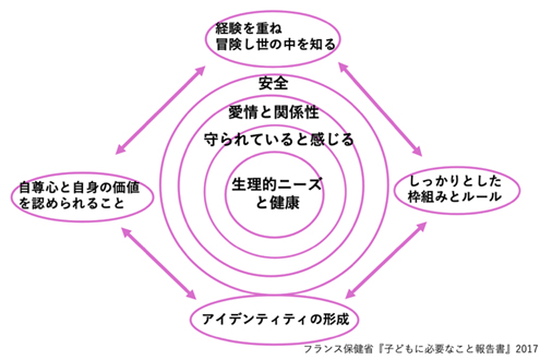 子どもにとって必要なことをフランスでは保健省が示している。その背景として、フランスでは2007年、法改正によって「悪い扱い」が起きてからの対応ではなく、予防を中心とした児童福祉のあり方への大転換が行われた。きっかけは2005年に45人の未成年への性犯罪で親や祖父母を含めた人々が裁判にかけられるという出来事があった。これに反応して子ども専門裁判官、県の子ども家庭担当管理職の二人が旗振り役になり、民間団体の代表や児童精神科医など現場実務者に呼びかけ「100人会議」を開催、「私たちはより良いパフォーマンスをすることができる」とメディアを賑わせた。問題が起きてから対応するやり方は変えなければいけない、子どもに相談することを求めるのは専門性とはいえないという意識が共有された。それは、専門職が十分訓練を受け子どもたちの不調のサインに気づくことができていれば、ここまで大勢の被害者を出さずに済んだという反省からである。社会的養護の対象になっている未成年人口の2%のみではなく(日本は0.2%)、全ての子どもが安全に生活できる社会にしなければならず、家庭や学校で困難を抱えている子どもについて、大変な状況になるのを待たず改善できる支えをしなければならないことが確認された。この立役者の一人であるローゼンヴィグ子ども専門裁判官は、フランスを代表する新聞の『ル・モンド』のホームページに連載を2005年から継続しており、2025年8月時点で907本もの記事を書いている。