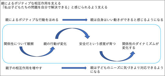 専門職は具体的には、以下のように、親子関係を観察する中でよくできていることをほめ、ポジティブな行動が強化されていく方法をとる。母子と公園に行ったり、父子と一緒にテーブルゲームをしたり、さまざまな機会をつくる。
