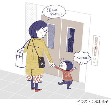 さあ、まずはリハーサルです。エレベーターの前に着いたらボタンを押して待っている間に、「誰かに会ったらこんにちは~だね」と合言葉のような声掛けをルーチンにすることにしました。いきなり本番の場面で「あいさつしなさい!」と促すのは、子どもにとってはかなりのプレッシャーです。リラックスした環境で、これから起こるかもしれない状況を予測させ、あらかじめ使うべき言葉を準備するようにしました。