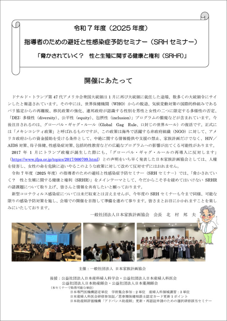 令和7年度(2025年度)の指導者のための避妊と性感染症予防セミナー(SRHセミナ-)では、「脅かされていく? 性と生殖に関する健康と権利(SRHR)」をメインテーマとして、今だからこそ手を緩めてはいけないSRHRの諸課題について取り上げ、皆さんと情報を共有したいと願っております。