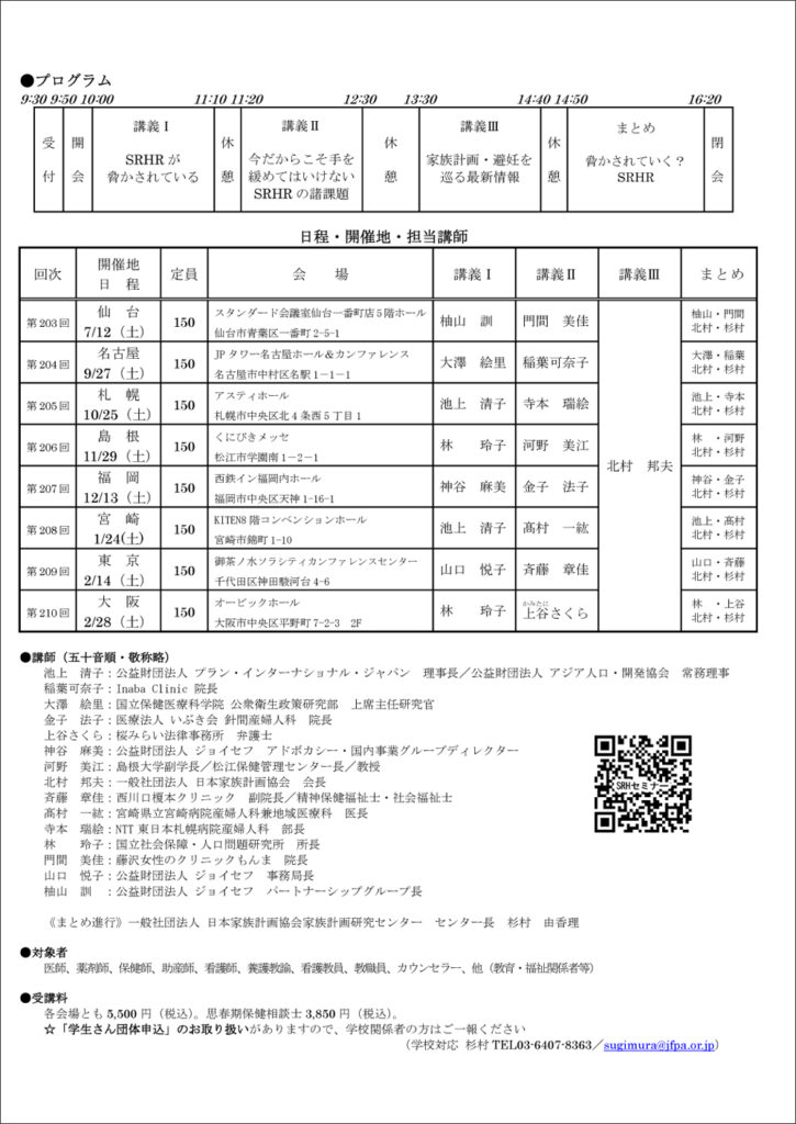 指導者のための避妊と性感染症予防(SRH)セミナー【名古屋・札幌・島根・福岡・宮崎・東京・大阪】(2025/9/27・10/25・11/29・12/13・2026/1/24・2/14・2/28)