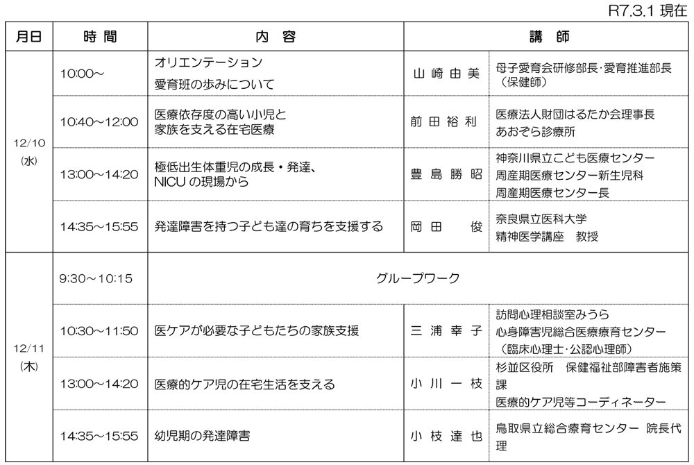 《母子愛育会》地域母子保健研修会 6.「支援が必要な子どもの保健指導(低出生体重児・医ケア・発達障害)」(2025/12/10~12/11)※申し込みは10/24まで