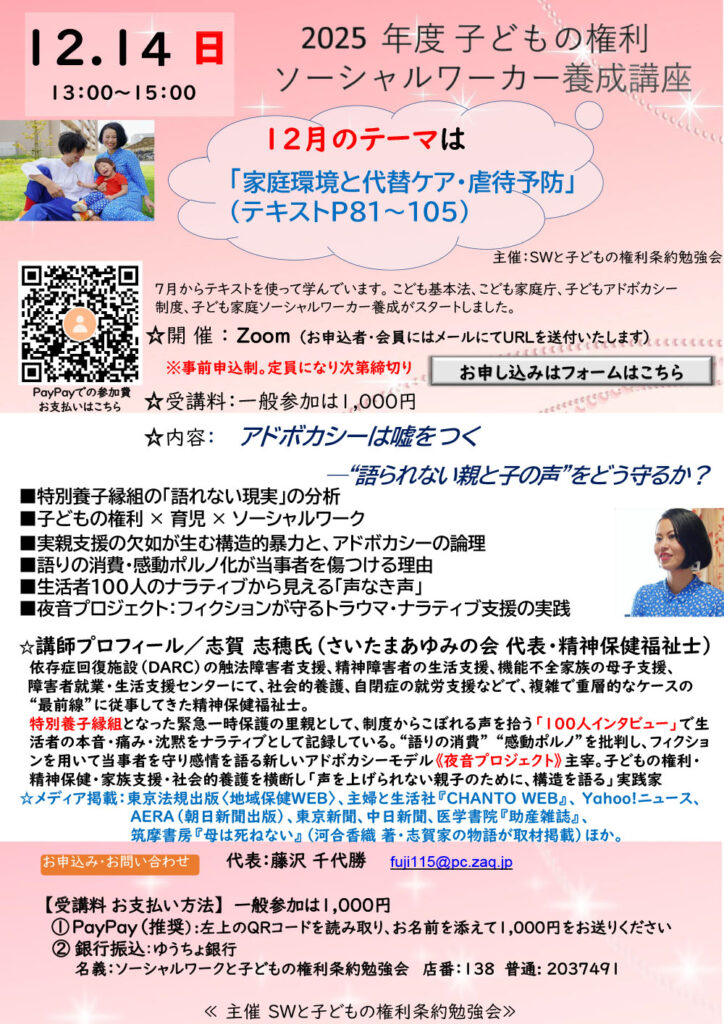 2025年度子どもの権利 ソーシャルワーカー養成講座、12月は「家庭環境と代替ケア・虐待予防」をテーマに、死産・障がいのある子の育児・特別養子縁組で親になった経験を持つ精神保健福祉士が、**「語られない親と子のナラティブ」**と、母子保健・家族支援領域の実務との接続について解説します。