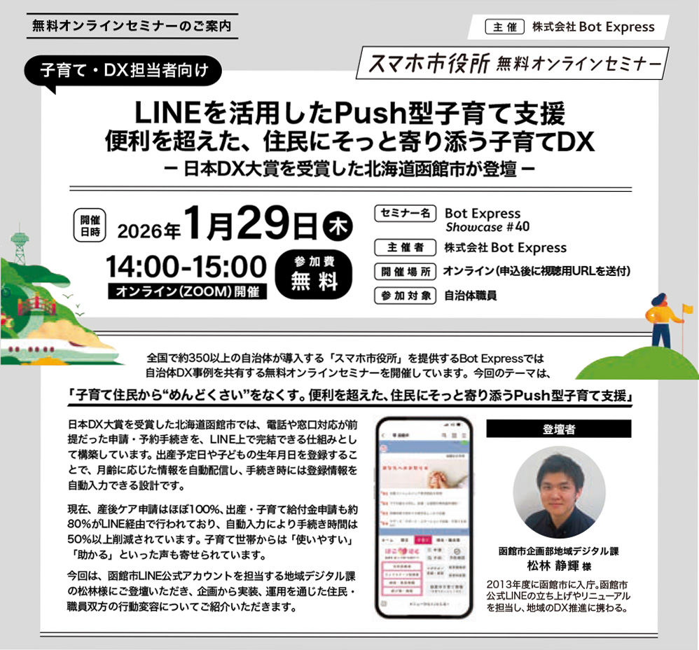 〈自治体子育て・DX担当者向け〉スマホ市役所 無料オンラインセミナー LINEを活用したPush型子育て支援 便利を超えた、住民にそっと寄り添う子育てDX(2026/1/29)