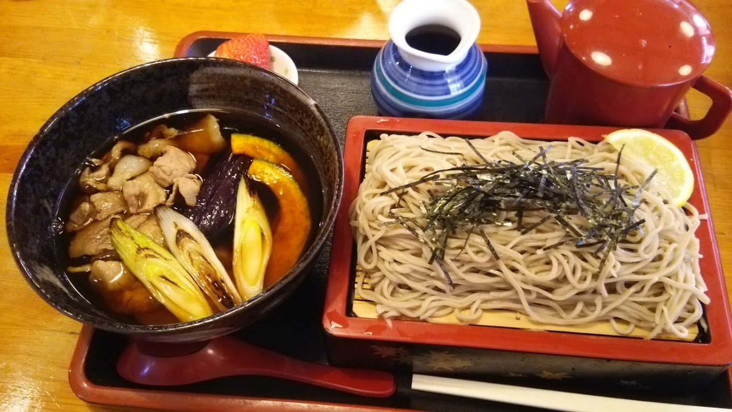 左側には野菜や肉がたっぷりの温かい汁のどんぶり、右側には、いわゆるもりそばである。