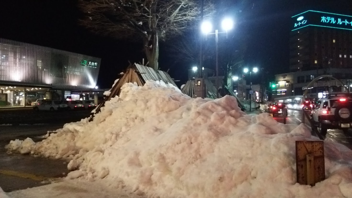 道路面は雪かきされていて全く問題ないが、駅の前でもこんな感じでやっぱり雪国だなって思う。
