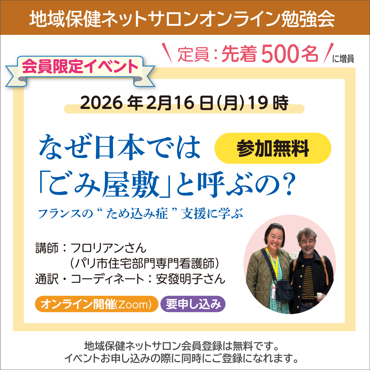 過去に地域保健編集部が主催したネットサロン会員限定のオンライン勉強会を、ご好評につきアーカイブ動画として再配信しています。視聴をご希望の方は、以下よりイベントごとにお申し込みをお願いします。会員登録がお済みでない方は、イベントお申し込み時にあわせて無料登録できます。会員登録について、詳しくは「地域保健ネットサロン」ページをご覧ください。