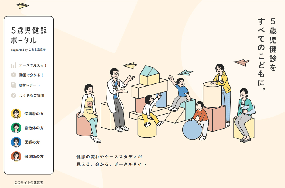 5歳児健診ポータルは、全ての子どもたちが保護者とともに安心して就学できる環境を作るため、5歳児健診の情報をまとめたサイトです。
