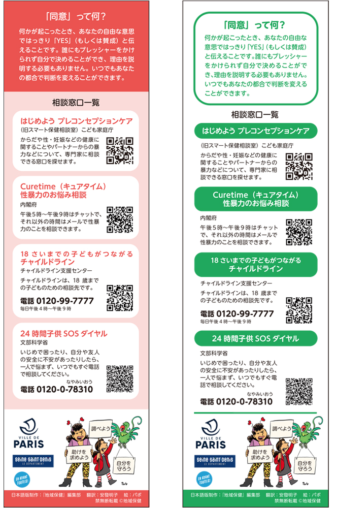 このたび地域保健では、パリ在住のフランスこども家庭福祉研究者・安發明子さんにご協力いただき、パリ市がこども・若者向けに配っている「暴力定規」の日本語版をつくりました。制作にあたり、地域保健ネットサロン会員の皆さまにもオンラインイベント等を通してご意見をいただくなどご協力いただきました。この場をお借りし、皆さまにお礼申し上げます。