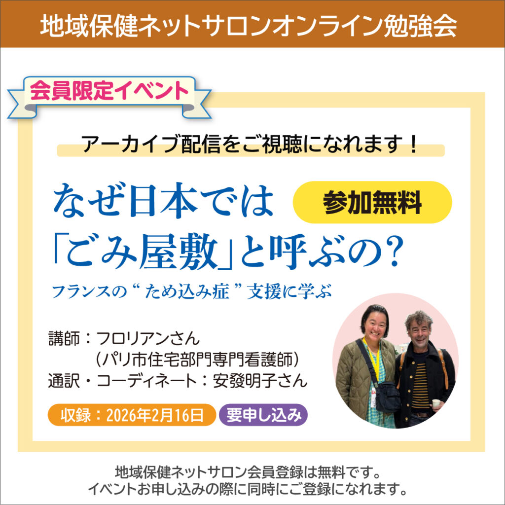 【アーカイブ配信中】地域保健ネットサロン オンライン勉強会 なぜ日本では「ごみ屋敷」と呼ぶの? フランスの”ため込み症”支援に学ぶ